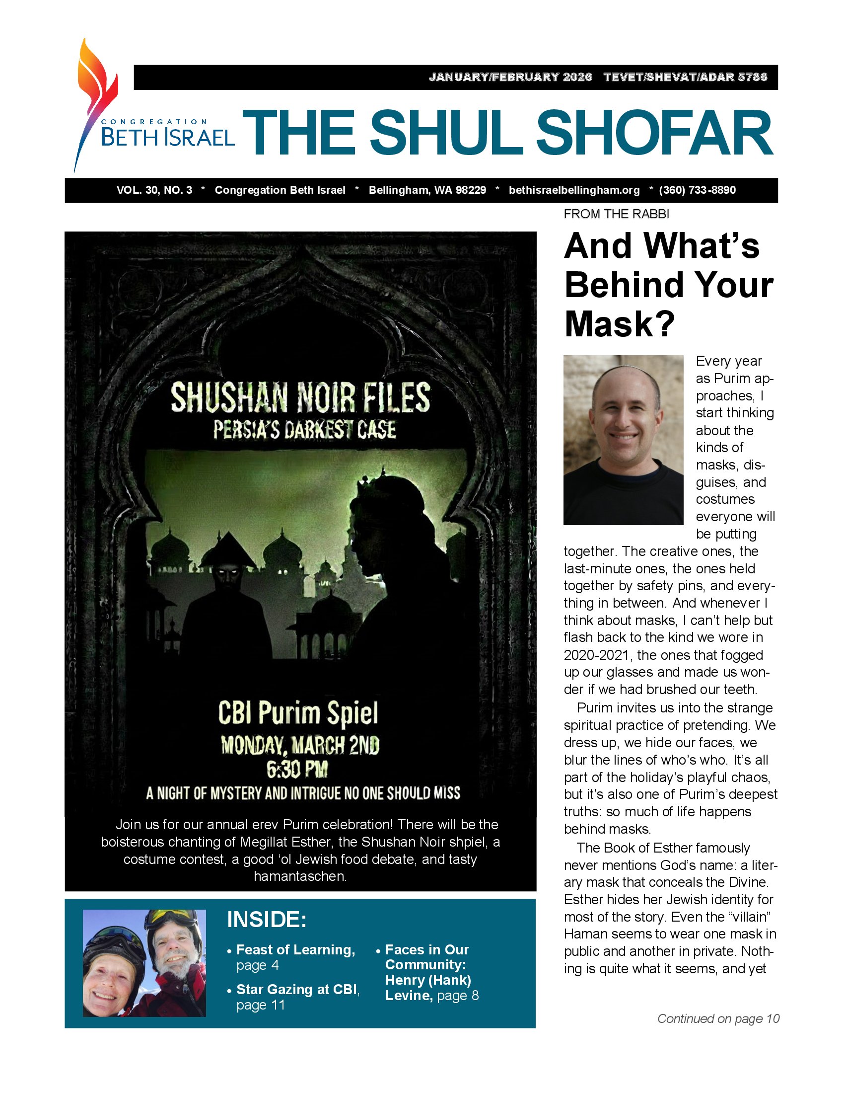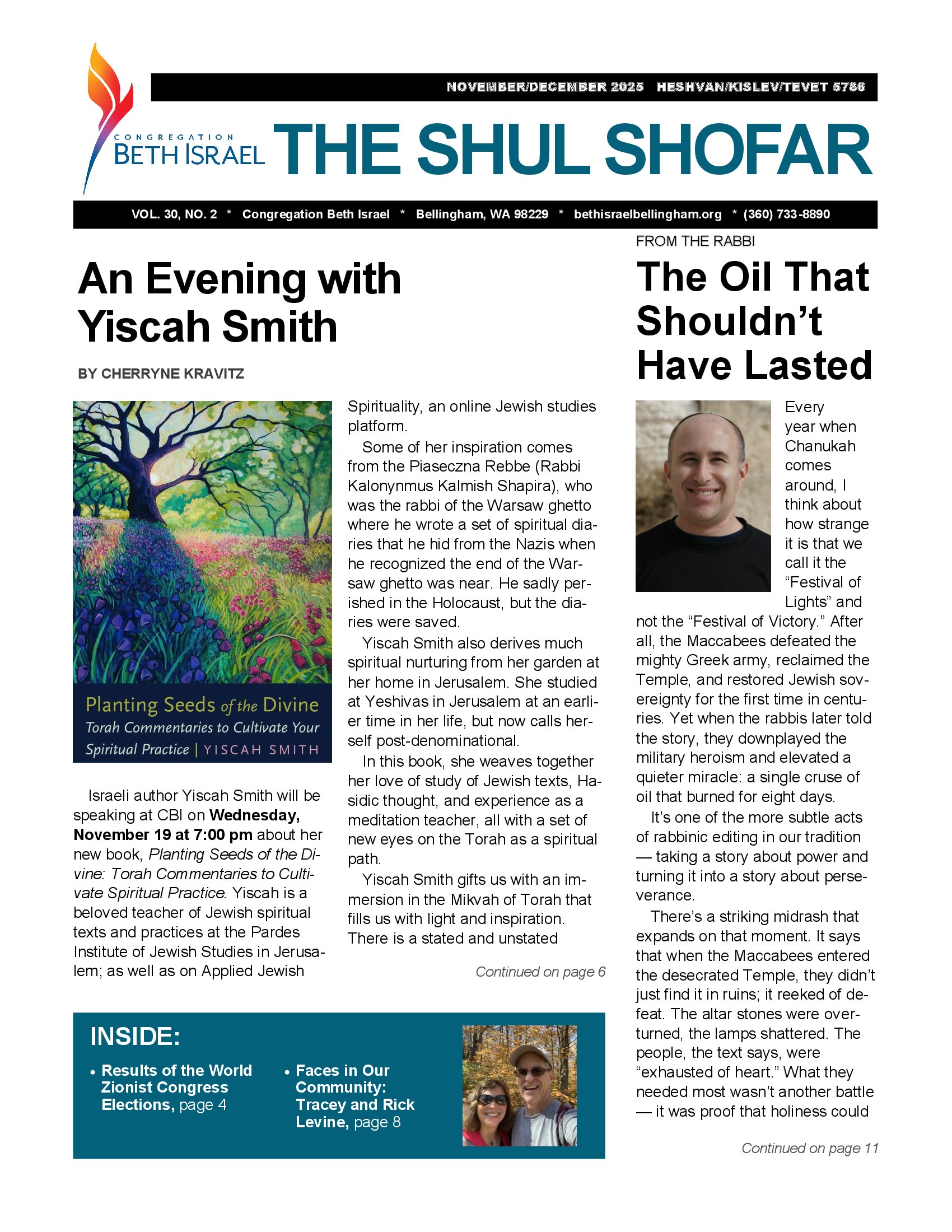 Please direct any suggested topics for board meetings to Executive Committee members, currently: President Erin Cohen, Vice President Jane Relin, Treasurer Karen Sloss, Secretary Tamar Clarke, past president Jodi Litt, and Rabbi Joshua Samuels, ex-officio.